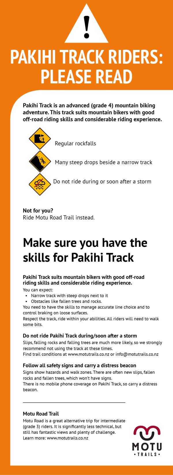 If you do not have appropriate skills and experience for an advanced (grade 4) track, you may wish to consider riding the Motu Road Trail instead or do the Pakihi as a walk.