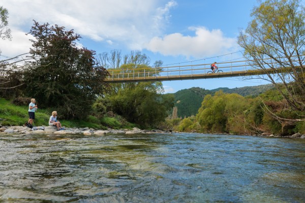 After stopping for refreshments in Wakefield follow the signs to cross SH6 and the Wai-iti River before turning left onto the purpose-built trail, which follows the river for 3.5km through pockets of native bush. Cross the river on the epic swing bridge – spanning almost 50m – then continue between the river and hop vines to Hoult Valley Road.