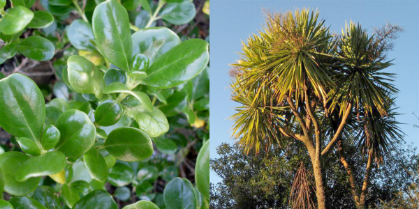 The shiny leaves of the Taupata/mirror plant (left), and an Aotearoa New Zealand classic Tī Kōuka/cabbage tree (DOC).