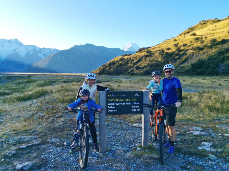 Sarah an whānau near the start of the Alps 2 Ocean (Not A Rail Trail)