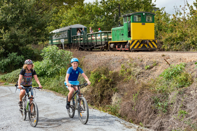 Racing the vintage train on the Twin Coast Cycle Trail between Opua and Kawakawa (Ruth Lawton Photography).