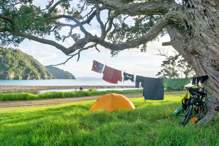 You essentially have two choices: built accommodation, including backpackers, cabins, motels, tramping huts or a friend’s house, or you can camp out in a small tent. You can also do a combo, of course. The advantage of camping is flexibility – you can stop for the night at any place where tenting is permitted. It’s also economical, of course. The disadvantage is the need to carry more gear – a tent, sleeping mat, cooking gear, etc. You can read more on our What to pack page.