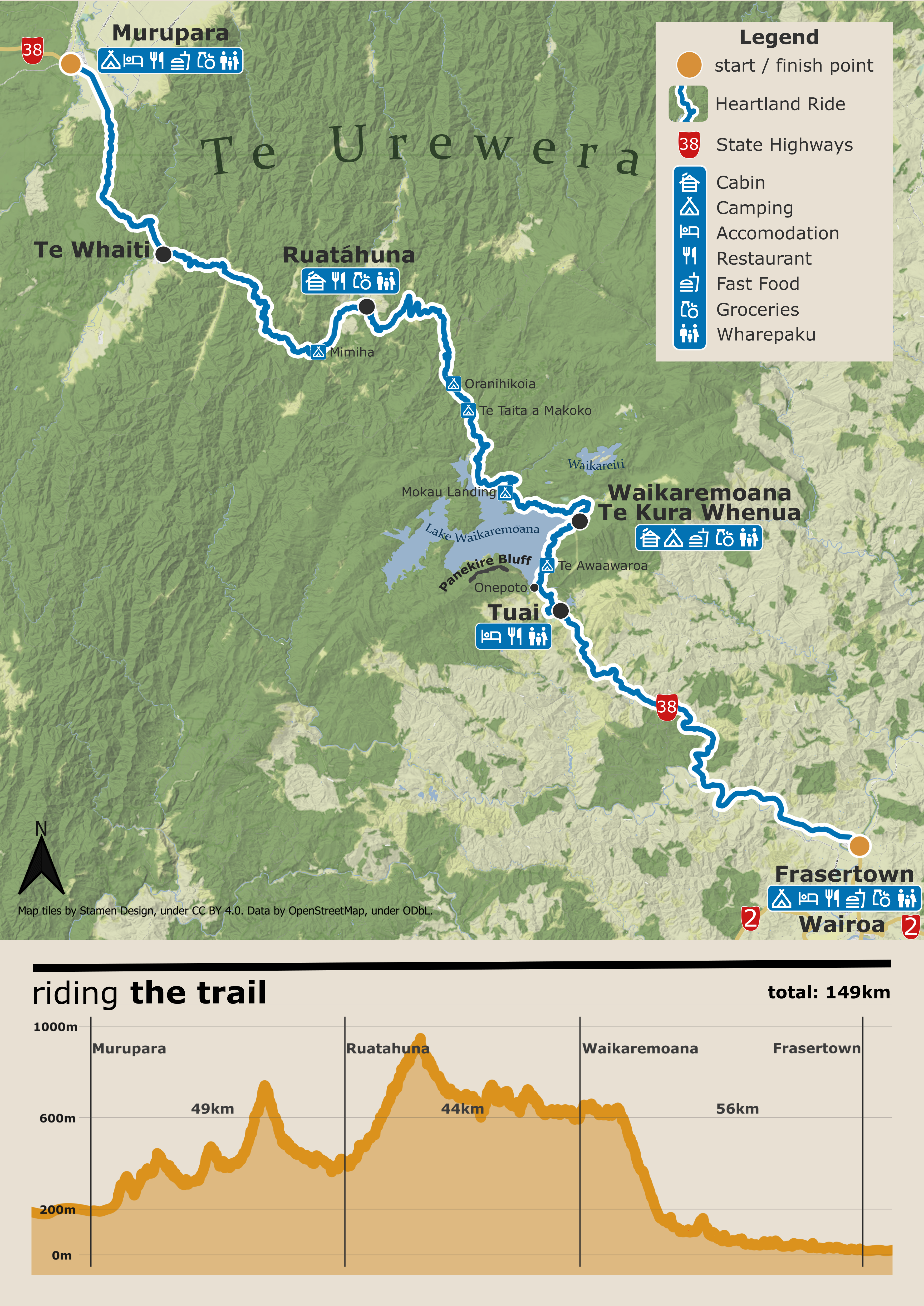 If using an e-bike, riders will need to recharge their batteries at Waikaremoana and Ruatāhuna. The large hills will drain the battery faster than usual. Riders should have good mechanical skills and carry a tool kit.